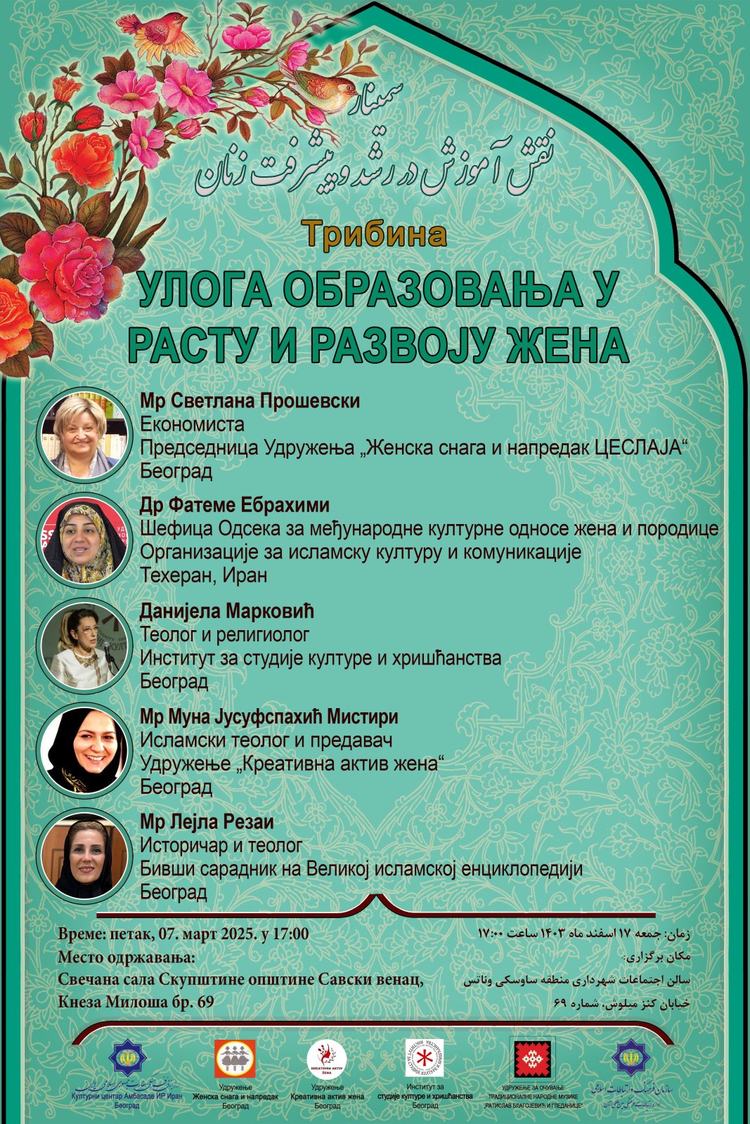 Поводом 8. марта, Међународног дана жена, Удружење „Женска снага и напредак ЦЕСЛАЈА“, Удружење „Креативна актив жена“, Институт за студије културе и хришћанства и Удружење за очување традиционалне народне музике „Ратислав Благојевић и Гледанице“, у сарадњи са Одсеком за међународне културне односе жена и породице Организације за исламску културу и комуникације и Културним центром Исламске Републике Иран у Србији, позивају вас на трибину на тему „Улога образовања у расту и развоју жена“.
